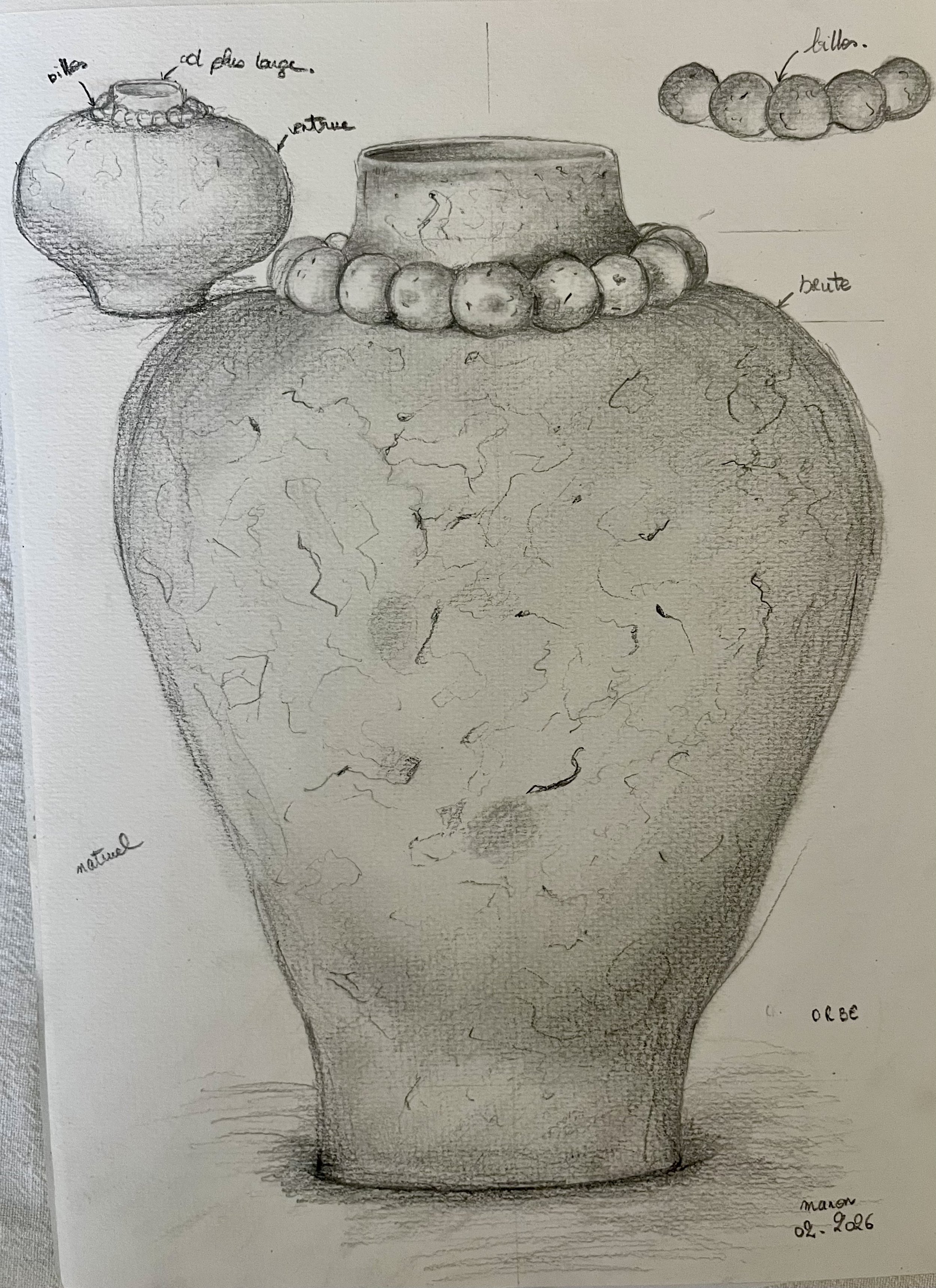 Le travail commence par le dessin. Une recherche de ligne, d’équilibre, d’élan.
